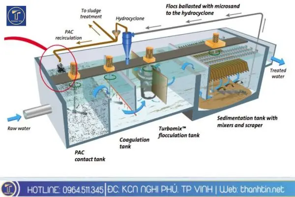 - Châm hóa chất PAC, polymer, phèn nhôm để kết dính các hạt nhỏ thành bông cặn lớn.