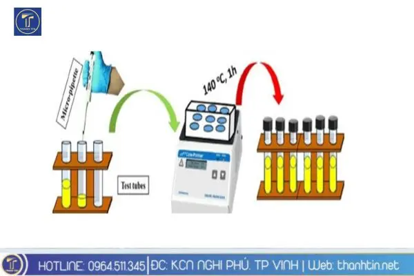 - Bước 2: Thêm dung dịch K₂Cr₂O₇ (kali dicromat) và H₂SO₄ (axit sunfuric) để oxy hóa các chất hữu cơ trong mẫu.